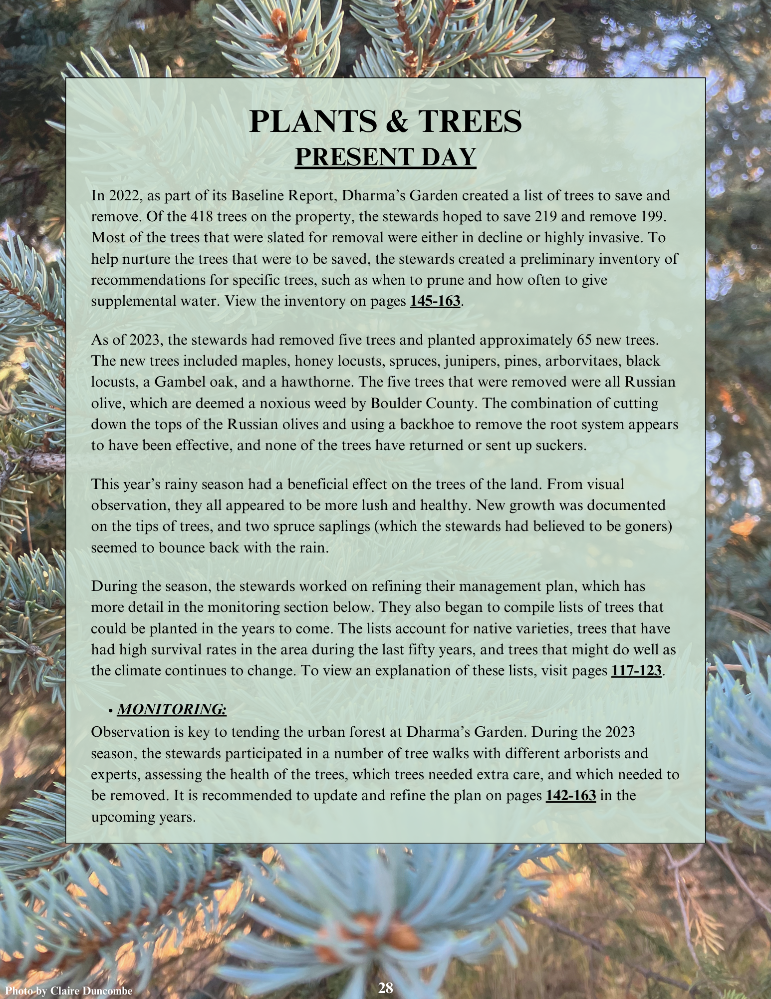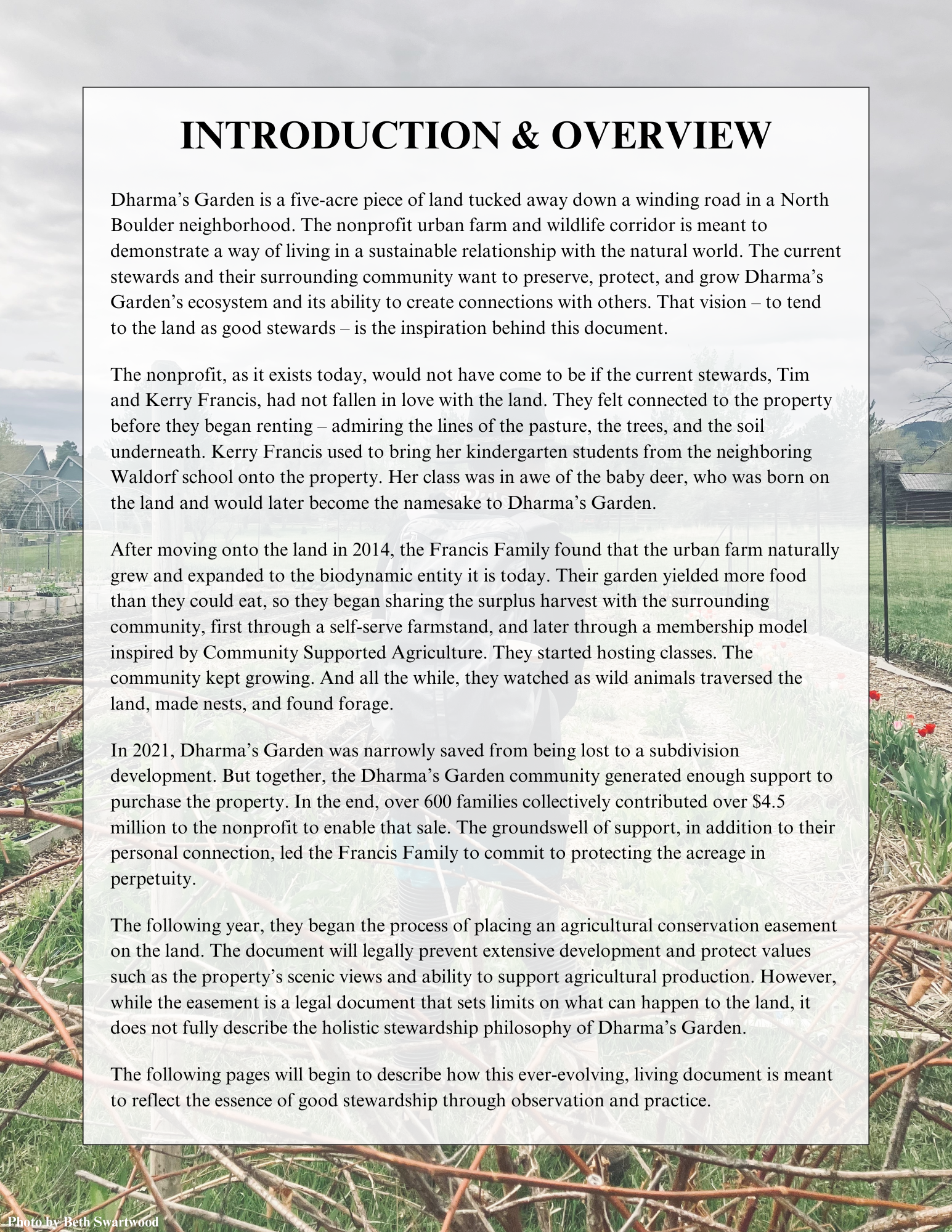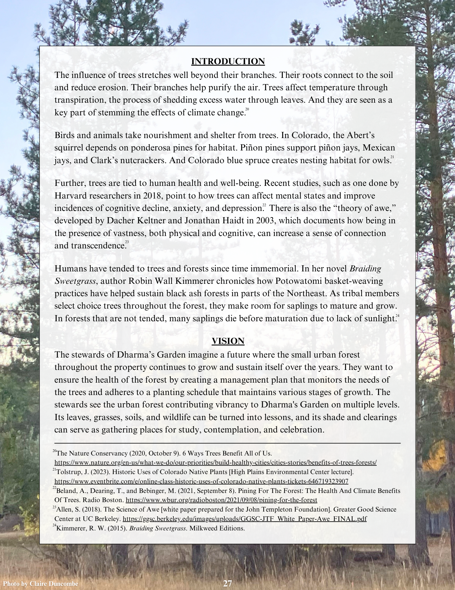 Dharma’s Garden, a nonprofit urban farm and wildlife corridor in North Boulder, Colorado, wanted to create a stewardship plan to help outline steps for caring for its land in perpetuity. My capstone team helped create a comprehensive 350-page plan that outlines short-, mid- and long-term goals for land management and includes monitoring, planting and other recommendations. Below is an excerpt from the project that highlights my individual contributions. I will soon include the entire stewardship plan for reference and enjoyment.